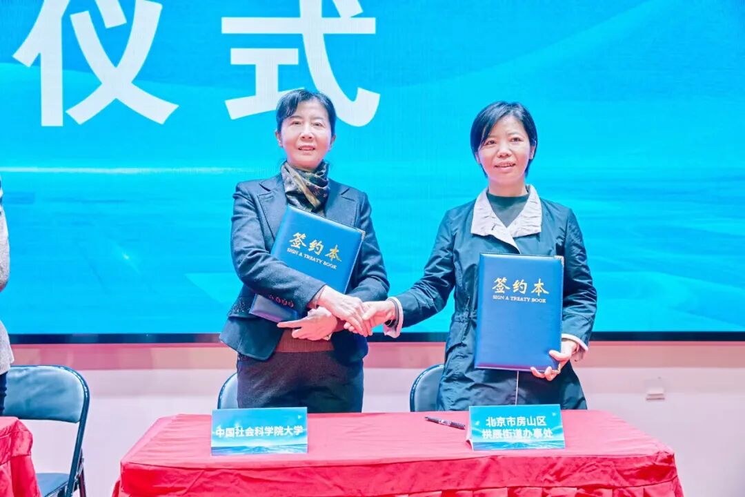 我校社会与民族学院执行院长赵一红同房山区拱辰街道办事处工委副书记谢美玲签约合影