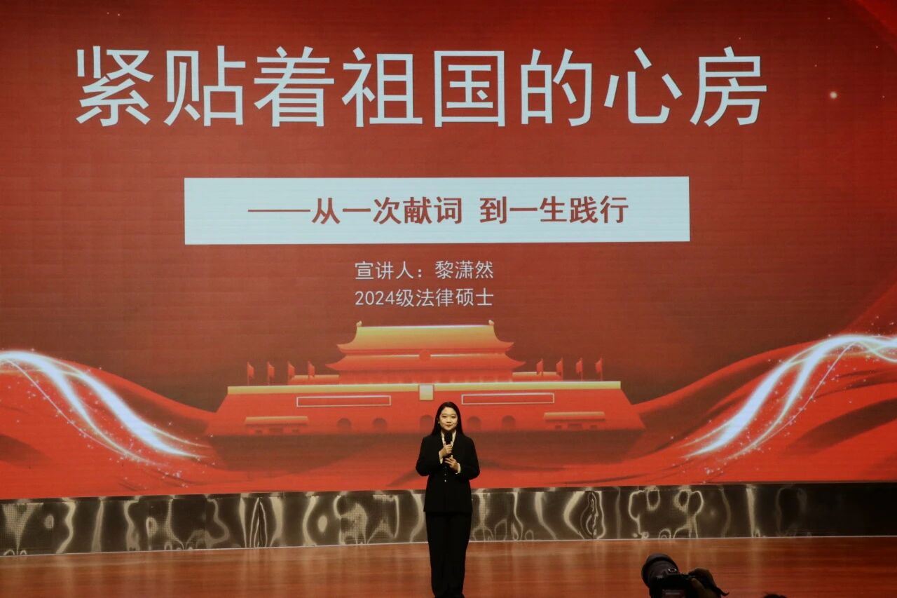 经济学院王语心讲述浙江舟山海岛乡村在“千万工程”引领下的蜕变,展现青年在乡村振兴中的作为。法学院黎潇然从天安门广场“请党放心,强国有我”的誓言出发,分享从一次献词到一生践行的成长。“边疆因奉献而美丽,青春因坚守而辉煌”,宣讲现场一片寂静,只有她清澈而坚定的声音在回荡,马克思主义学院杜雨晴讲述一家三代接力扎根建设新疆的故事。社会与民族学院王子正、法学院周禹彤以支付方式变迁为线索,勾勒出从“票证时代”到“扫码支付”的中国发展轨迹。