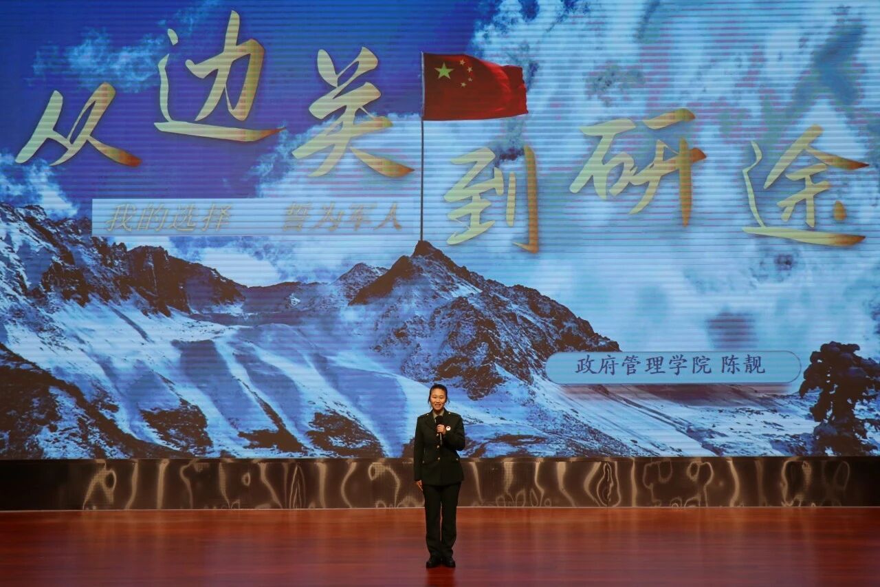 政府管理学院陈靓以“从边关到研途:我的选择,誓为军人”为题,讲述了从中印边境坚守到返校深造的转变,立志终身服务退役事业。“床单就是裹尸布,如果牺牲了,就睡在床单下面……”台下,不少同学眼含热泪,掌声一次次自发响起。经济学院丁晴展示基层群众赠予的“护身符”,诠释一份沉甸甸的信任。法学院李勇以军装与志愿者制服的更迭为主线,分享在平凡岗位为国家发光发热的初心。社会与民族学院佟欣展开一场跨越八十年的青春对话,从曾外祖父的战火伤痕到自己在纪念中国人民抗日战争暨世界反法西斯战争胜利80周年大会的志愿服务,展现为国奉献的代代相传。