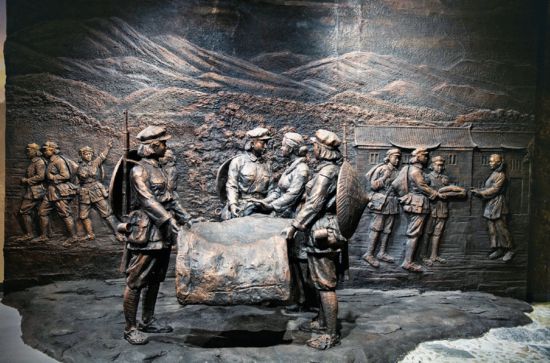 “半条被子”的故事充分体现了中国共产党的人民情怀和为民本质。图为在湖南省郴州市汝城县沙洲瑶族村“半条被子的温暖”专题陈列馆拍摄的“半条被子”故事雕塑。 新华社记者 陈思汗/摄
