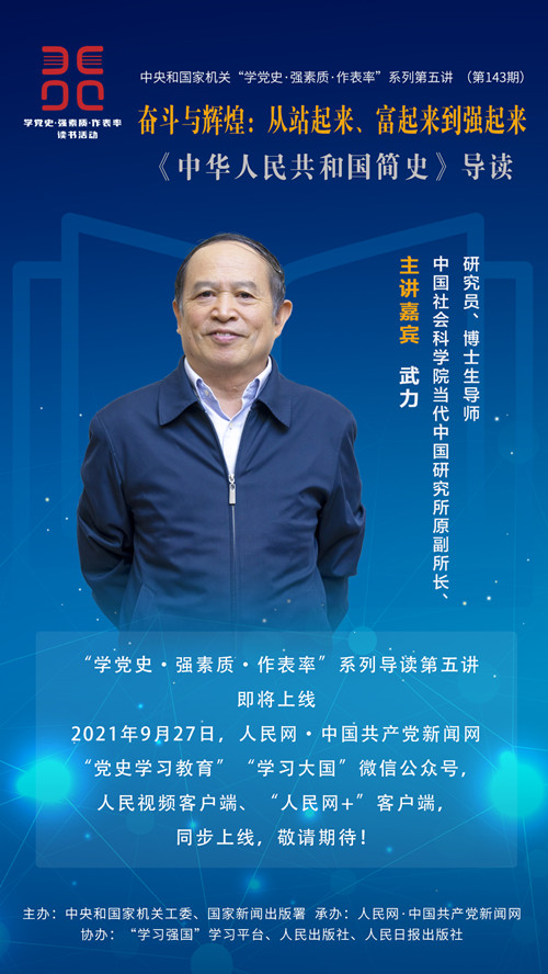 本次讲座是中央和国家机关“学党史·强素质·作表率”读书活动的第五讲。9月27日,中国社会科学院当代中国研究所原副所长、研究员、博士生导师武力开讲,带领大家一起学习《中华人民共和国简史》这本读物。