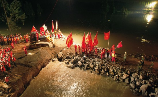 2021年7月17日至23日,河南持续遭遇极端强降雨天气。7月22日,鹤壁市浚县新镇镇彭村段卫河大堤发生决口。前来救援的中国安能集团在抢险一线成立4个党小组,分别负责现场指挥、决口封堵、裹头加固、综合保障工作。在党小组的组织下,现场169名救援人员汇聚成冲不垮的“红色堤坝”,经过70多个小时的艰苦奋战,终于使卫河大堤决口合龙。这是2021年7月26日凌晨决口成功合龙后,救援人员在大堤上挥舞红旗(无人机照片)。 新华社发 张小明/摄