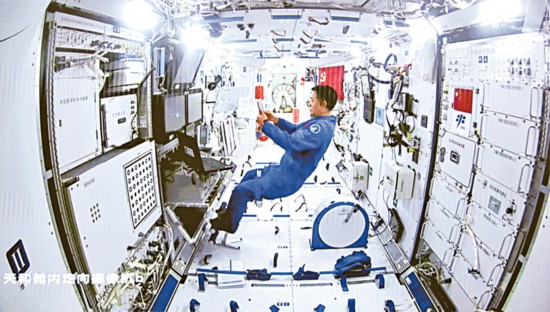 2021年6月17日,神舟十二号载人飞船发射升空。飞船搭载了一面党旗,这面党旗在中国共产党成立100周年之际进入中国空间站内,经历了我国空间站阶段首次载人飞行任务取得圆满成功的全过程。图为2021年7月4日,在北京航天飞行控制中心大屏拍摄的天和核心舱内航天员聂海胜配合支持两名出舱航天员开展舱外操作。 新华社记者 金立旺/摄
